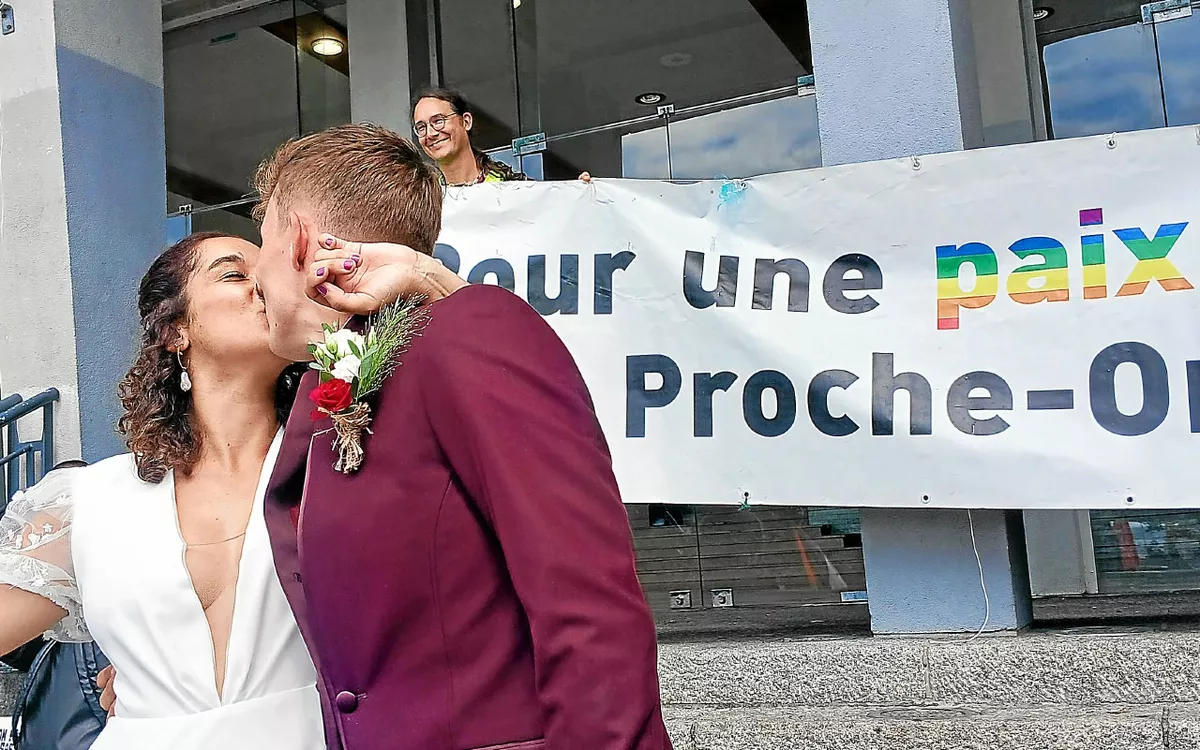 Ils s’appellent Côme et Emilie et brusquement, ils ont changé d’escalier. Alors qu’ils venaient de convoler en justes noces, les (très) jeunes époux ont librement choisi de s’embrasser sous la banderole réclamant la paix au Proche-Orient, ce samedi 31 août 2024, devant l’hôtel de ville de Brest. « La Palestine, c’est une cause qui nous touche tous les deux », assure Côme, magnifique dans son costume bordeaux, avant de rejoindre famille et amis de l’autre côté de la rambarde.