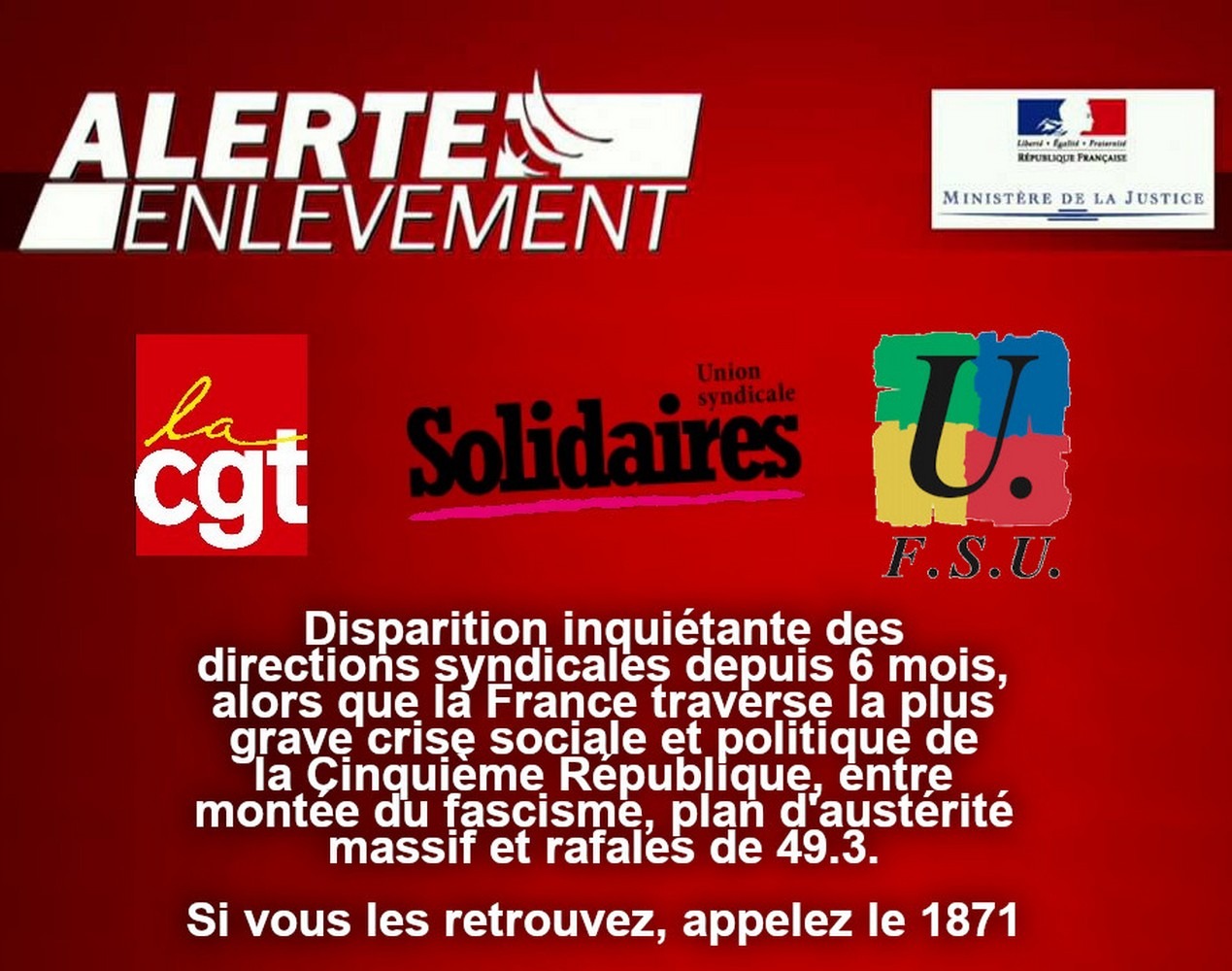 Pourtant, les directions des grands syndicats français semblent s’être volatilisées. Elles n’ont appelé à la grève ni contre le coup de force de la rentrée, ni contre les 49.3 de Barnier puis de Bayrou, ni contre le plan d’austérité, ni contre les attaques contre le RSA, le droit au chômage ou encore contre l’explosion des prix… Pas une seule date de grève nationale, même symbolique, même timide, même rituelle. C’est donc une disparition inquiétante. Si vous les retrouvez, n’agissez pas seul, organisez-vous.