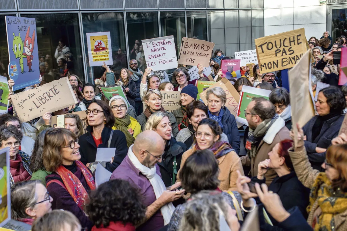 Au milieu de la foule, Agnès Duperrin, la secrétaire CFDT du CSE, monte sur une table sans mégaphone. « Il est hors de question que le rapprochement des droites se fasse via Bayard, s’époumone-t-elle, sous les applaudissements et même une casserolade. Notre richesse, c’est justement notre ouverture d’esprit, notre pluralisme, le fait qu’on s’adresse à des milieux sociaux et à des couleurs politiques différents. » Salarié d’Okapi, Patrice n’en revient pas. « C’est exceptionnel pour Bayard qu’on soit autant à se mobiliserC’est rare de voir la presse jeunesse, la presse adulte et l’édition se rassembler autour de la même cause»
