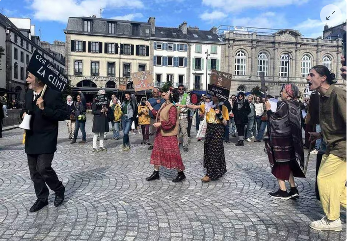 La timide mobilisation s’est étendue jusqu’à la pointe de la Bretagne, à Quimper (Finistère) notamment, où quelque 115 personnes ont assisté à une mobilisation joyeuse et festive à l’ombre de la cathédrale Saint-Corentin. Un rassemblement dans la bonne humeur portée par La Troupe populaire, un collectif qui a imaginé une rencontre entre « pro-climat » et « climatosceptiques ».