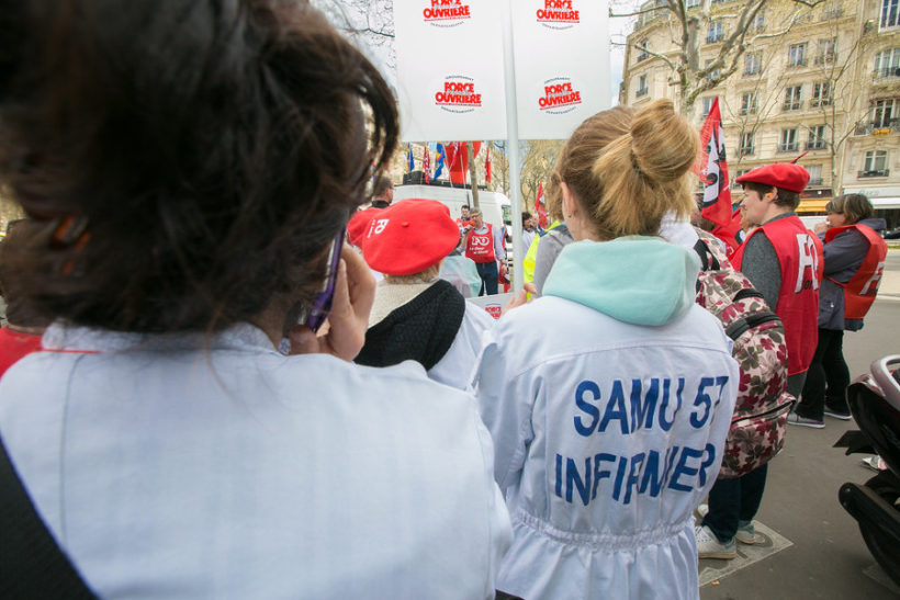 Les personnels hospitaliers des urgences en grève le 11 avril 2018 étaient rassemblés, à l’appel de la Fédération FO des Services publics et de Santé, devant le Ministère des Solidarités et de la Santé contre les mesures prises ou annoncées qui remettent en cause le service public et agravent leurs conditions de travail.