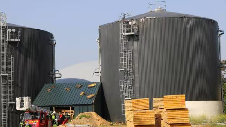 L’unité de méthanisation de l’entreprise Bel se composait de deux « digesteurs » de 2 500 m3. L’implosion a eu lieu dans celui de droite, le 27 juin 2019, au lieu-dit Kerscao-Bian, à Plouvorn. Presque six ans plus tard, l’audience pour calculer le montant de la perte d’exploitation et examiner les responsabilités s’est tenue le vendredi 24 octobre au tribunal de commerce, à Brest. | ARCHIVES OUEST-FRANCE
