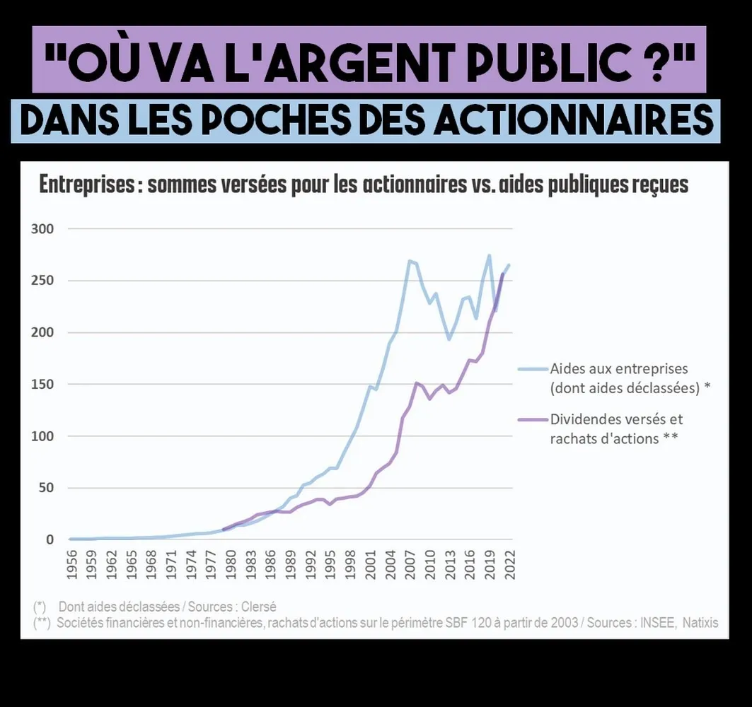 On voit que depuis les années 1990, il y a une explosion des aides aux entreprises, passées de 40 milliards d’euros par an il y a 30 ans, à plus de 250 milliards par an en 2022. Quasiment 1000% d’augmentation pour les aides publiques au secteur privé, alors que dans le même temps, les salaires ne suivent même pas l’inflation. Vous payez des taxes pour les patrons.