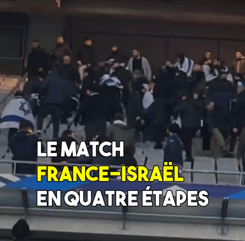 1 – Des hooligans d’extrême droite israéliens ont, d’entrée de jeu, attaqué des supporters français en les tabassant au sol, à 20 contre 1. Ce sont les mêmes hooligans qui pleurnichaient après avoir reçu quelques coups à Amsterdam. Cette fois-ci, personne n’a parlé de «pogrom», de «lynchage» ni de «nuit de cristal». Et plus étonnant encore, malgré les milliers de policiers et de stadiers dans un lieu ultra-sécurisé et filmé sous tous les angles, les agresseurs sionistes ont pu agir en toute impunité, et aucun d’entre eux n’a été arrêté. Imaginez la situation inverse : si des supporters israéliens avaient été frappés au sol en plein stade.