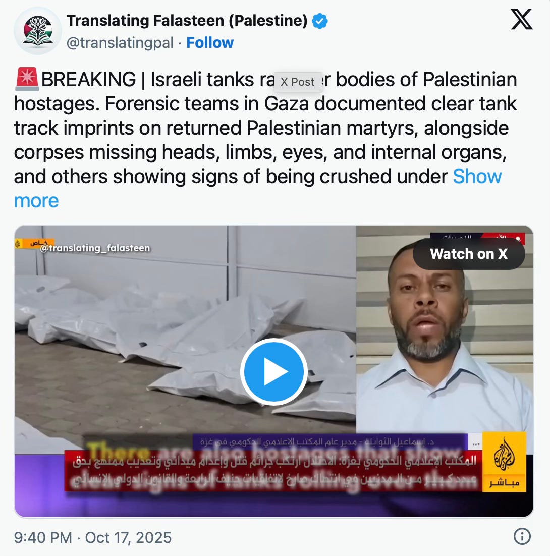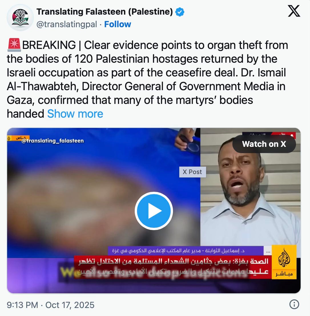 Le bureau des Médias du gouvernement de Gaza a officiellement accusé Israël le 17 octobre d’avoir volé des organes à des Palestiniens après qu’Israël a restitué 120 corps mutilés à la suite du récent cessez-le-feu, dont certains ont été torturés à mort.