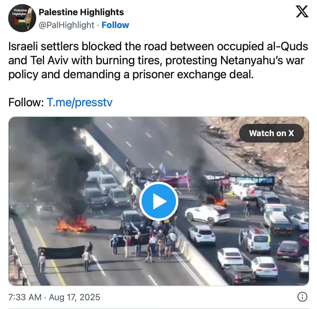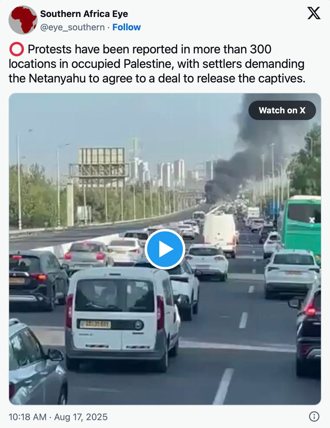 Les familles d’Israéliens détenus lancent une grève nationale & occupent plus de 300 lieux, bloquant les autoroutes & assiégeant les domiciles des ministres pour réclamer le retour de leurs proches.