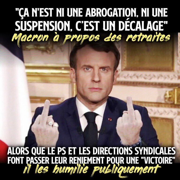 Le PS et les directions syndicales se vantaient d’une «suspension» de la réforme des retraites et d’une «avancée», Macron les détruit en affirmant que ce n’est «ni une abrogation, ni une suspension, c’est un décalage»