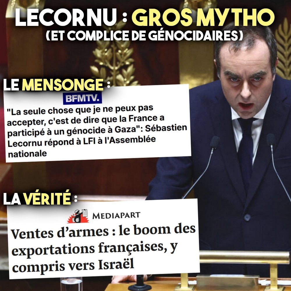 Sébastien Lecornu, c’est ce sinistre personnage que Macron nous a imposé comme Premier ministre non pas une, mais deux fois. Lecornu est un technocrate froid, sans scrupule, qui ment comme il respire. Rappelez-vous, il avait déjà menti sur son pseudo diplôme de droit, affiché sur son CV officiel alors qu’il ne l’a jamais obtenu. Lecornu, c’est celui qui fait le lien entre le clan présidentiel et l’extrême droite : il avait organisé en avril dernier un dîner secret avec Marine Le Pen et Jordan Bardella. En janvier, il signait avec Bruno Retailleau une tribune pour réclamer la fin du droit du sol à Mayotte. Lecornu enfin, c’est l’ancien Ministre des Armées, celui qui tient lieu, de fait, de VRP des marchands d’armes bleu blanc rouge, dont les avions et les obus vendus partout dans le monde servent à commettre des génocides et des guerres. Des armes dont se sert l’entité génocidaire israélienne pour massacrer le peuple palestinien depuis des décennies.