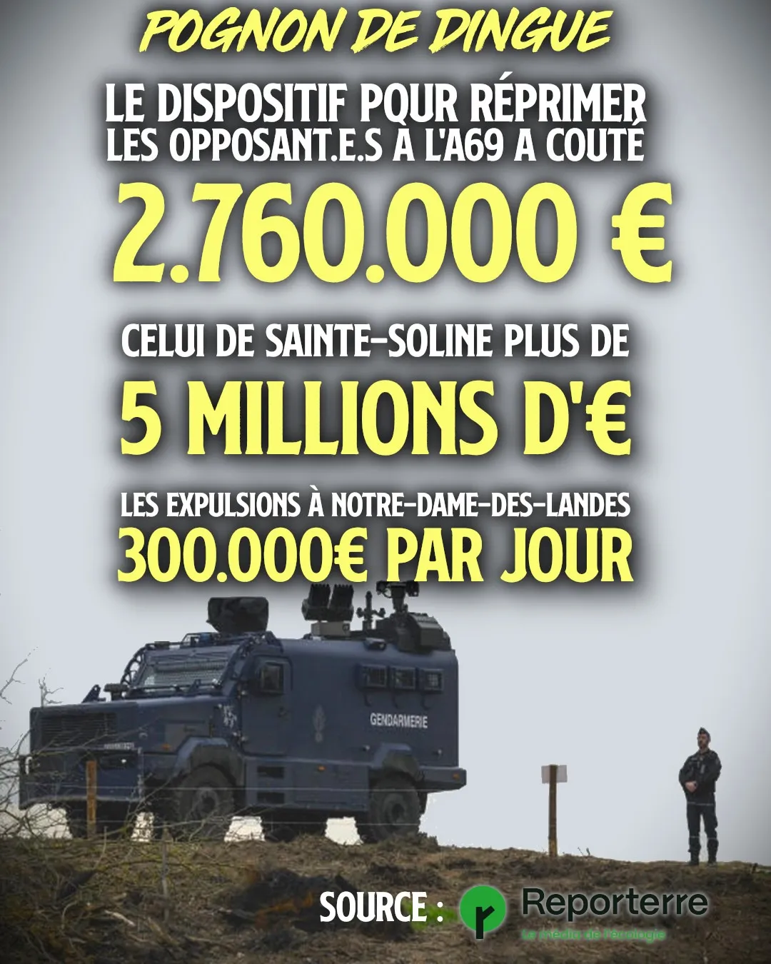 Le média Reporterre a fait le calcul en ce qui concerne la mobilisation contre l’A69, ce projet d’autoroute délirant entre Castres et Toulouse, massivement contesté par la population locale : 2.760.000€ rien que pour réprimer les opposant.e.s.