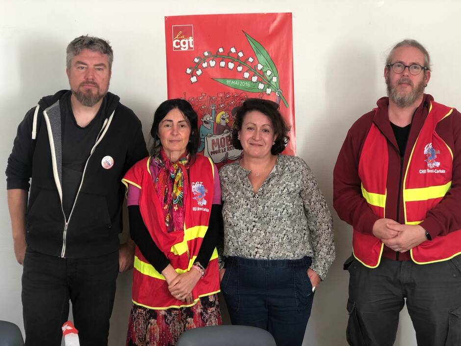 De g à d : Franck Monfort, secrétaire départemental CGT à la santé et l’action sociale ; Babar Bourhis, de la CGT du CHRU ; Salma Budzinski, aide-soignante aux Amitiés d’Armor ; et Thomas Bourhis, responsable de la CGT du CHRU de Brest-Carhaix.