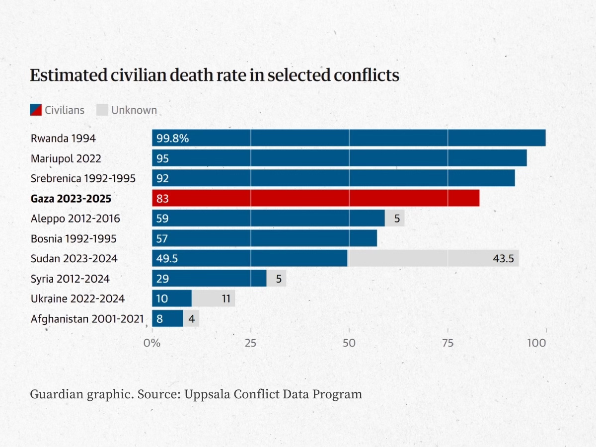 a déclaré Therese Pettersson, du Programme de données sur les conflits d’Uppsala (UCDP), qui recense les victimes civiles dans le monde entier. Elle a ajouté pouvoir trouver des taux de victimes civiles similaires en isolant une ville ou une bataille spécifique dans le cadre d’un conflit plus large, mais “très rarement” à l’échelle d’une guerre entière.
