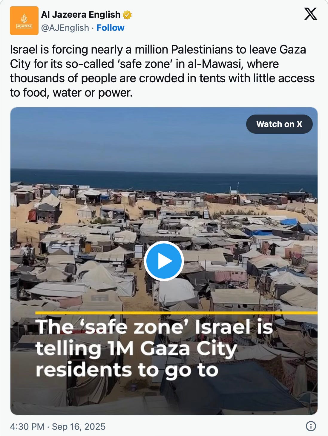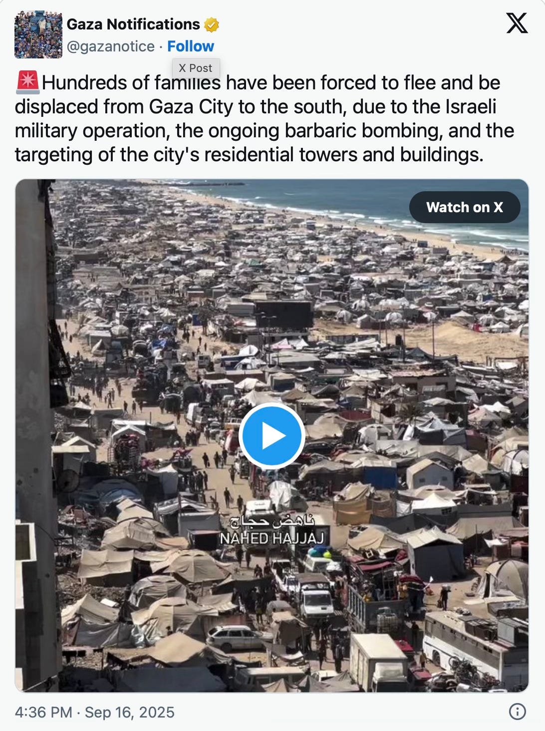 Selon un communiqué publié le 16 septembre par le bureau des médias du gouvernement de Gaza, environ un million de Palestiniens de la ville de Gaza et du nord de la bande de Gaza refusent ou ne peuvent être déplacés de force vers les “zones de sécurité” surpeuplées du sud de Gaza.