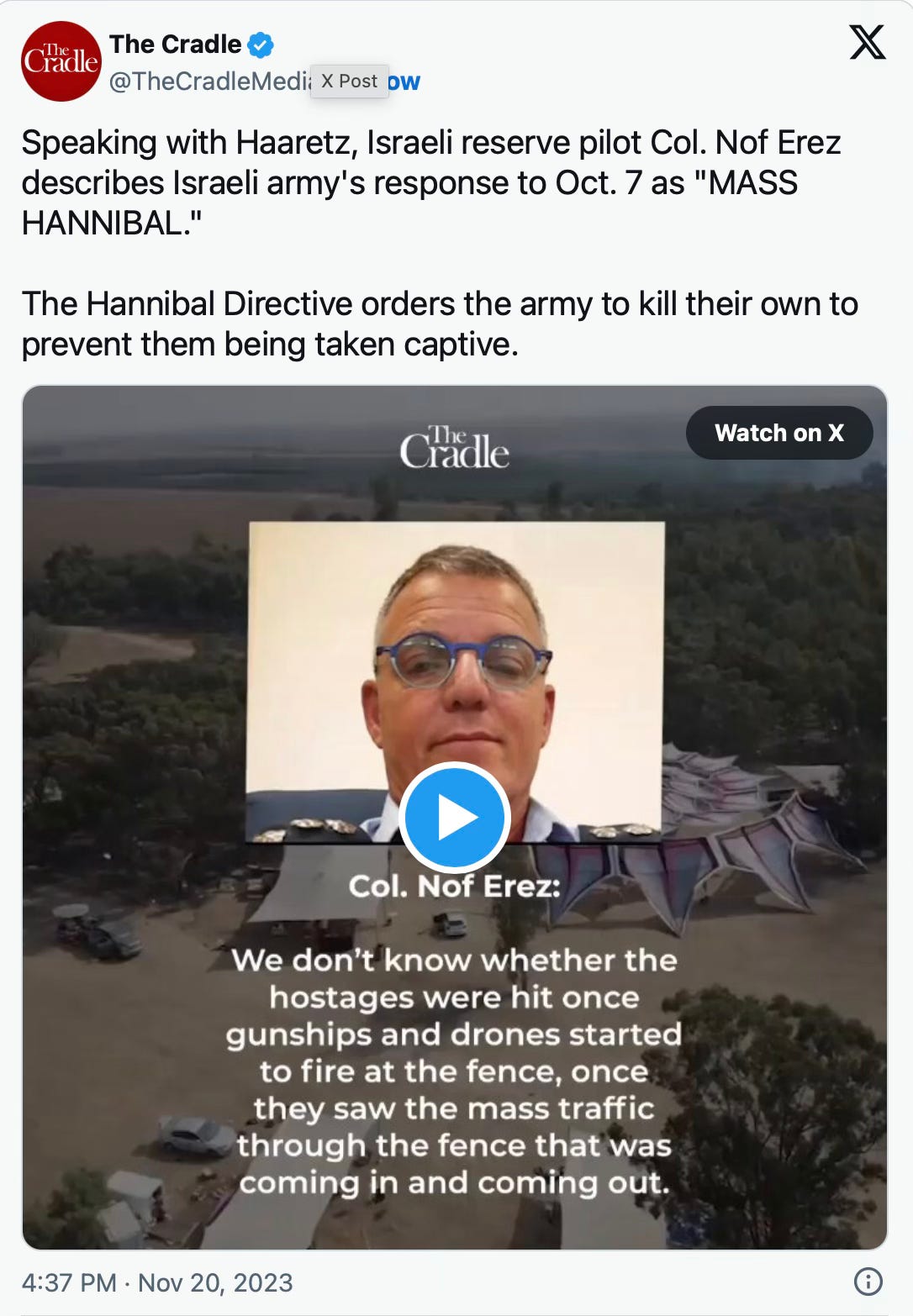 Dans une interview accordée à Haaretz, le pilote de réserve israélien, le colonel Nof Erez, décrit la réponse de l’armée israélienne au 7 octobre comme un “HANNIBAL DE MASSE”. La directive Hannibal ordonne à l’armée de tuer ses propres soldats pour éviter qu’ils ne soient faits prisonniers.